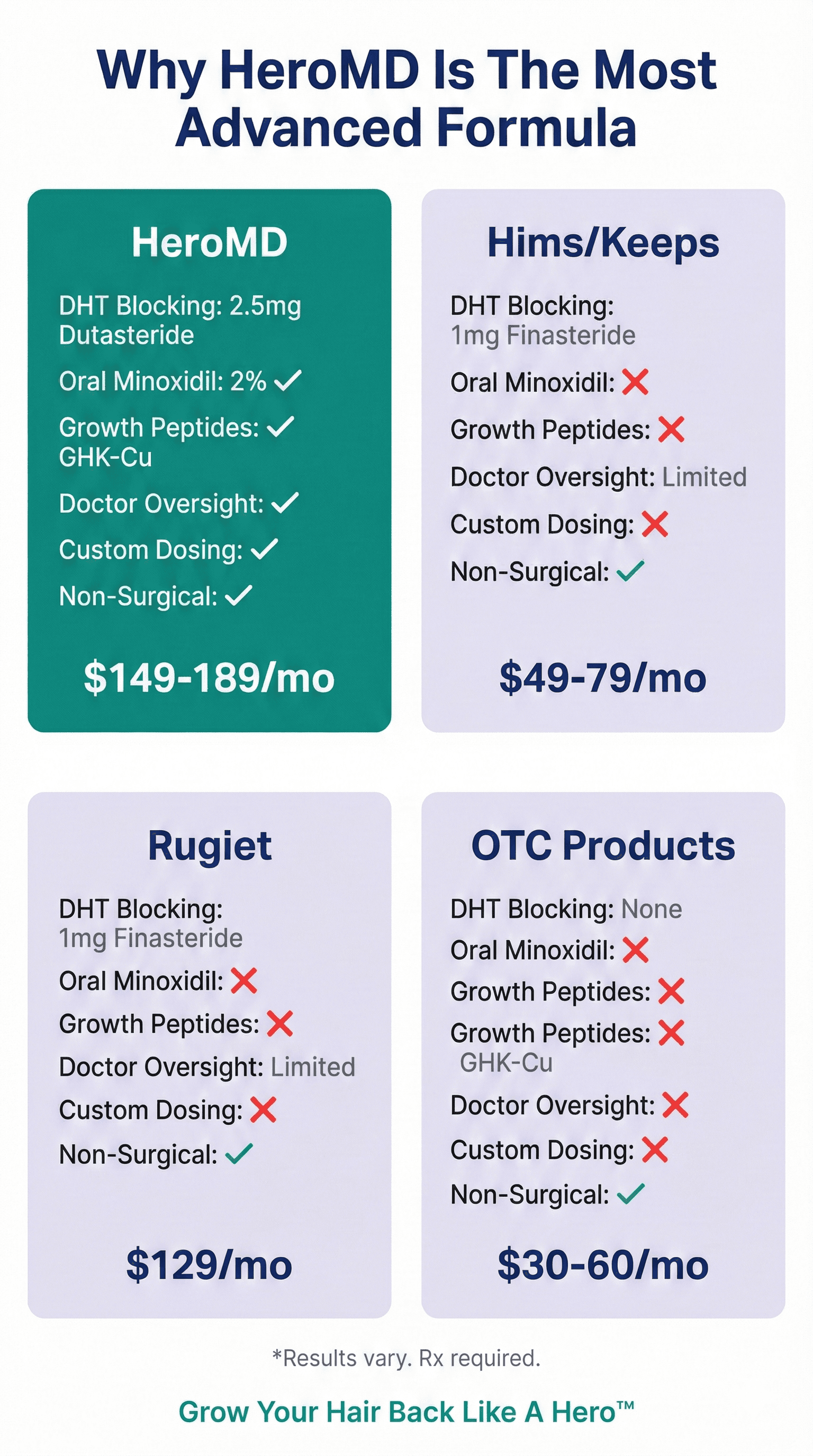 - Blocks 95% of DHT (vs 70% with finasteride) - 25% more potent than standard treatments - Physician-prescribed maximum strength dose - FDA-approved compound for hair restoration